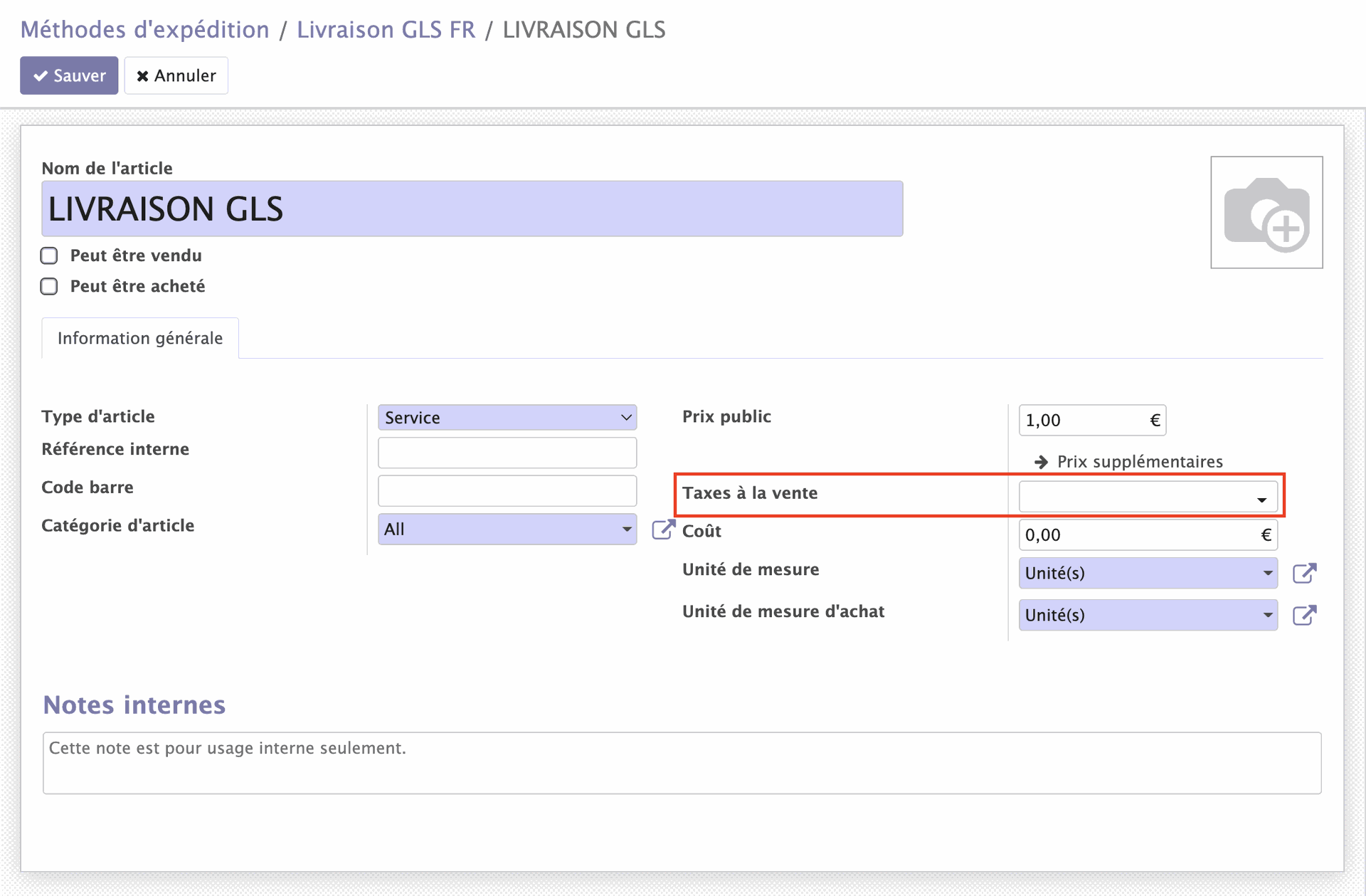Il nous faut tout d'abord créer un article de type "Service" dédié aux expéditions facturées hors taxe en supprimant les taxes à la vente.