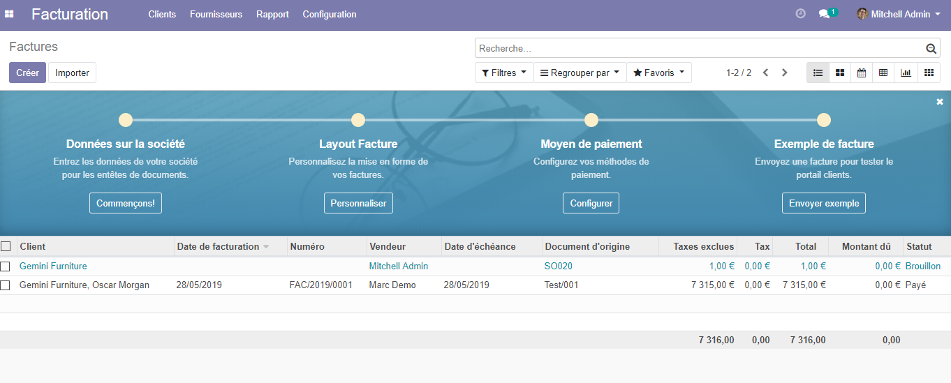 La page principale de l'application "Facturation" contient toutes vos factures, payées ou en attente (Brouillon). Les Menu vous permettront d'accéder aux factures, avoirs, paiements, et listes de vos clients et fournisseurs.