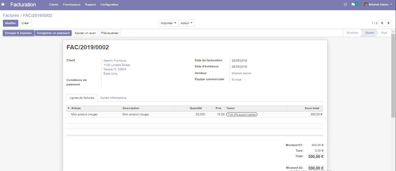Un Numéro unique est alors attribué à votre facture et le document passe automatiquement de l'état brouillon à l'état ouvert (en attente de paiement).