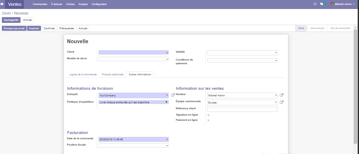 Si vous ne disposez pas encore de client ou de produit dans votre environnement odoo, vous pouvez les créer à la volée directement à partir du champ "Client".