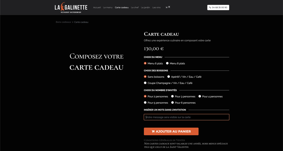 Le client peut désormais commander en ligne son bon cadeaux en sélectionnant les différentes combinaisons possibles (Nombre d'invités, Choix du menu et des boissons ...) ainsi que laisser un message au destinataire de la carte.
