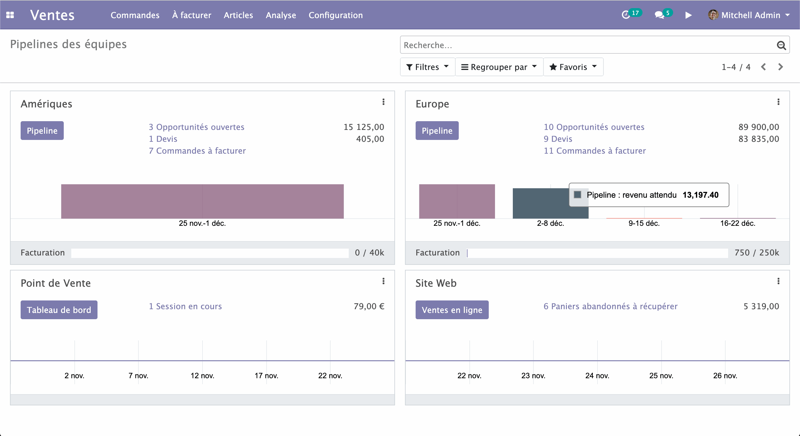 Depuis cet espace, vous pouvez accéder directement aux opportunités ouvertes, devis en cours et commandes pour chacune de vos équipes commerciales. Des graphiques vous présentent également l'évolution des chiffres selon la configuration de l'équipe ainsi que l'objectif de facturation.